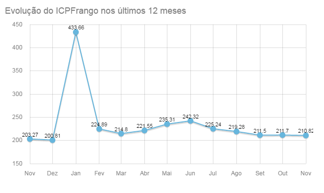 Por outro lado, os custos de produção registraram recuo em novembro, segundo aponta a Embrapa Suínos e Aves. No mês o índice ICPFrango/Embrapa anotou 210,82 pontos, caindo 0,48% na comparação com os dados de outubro.