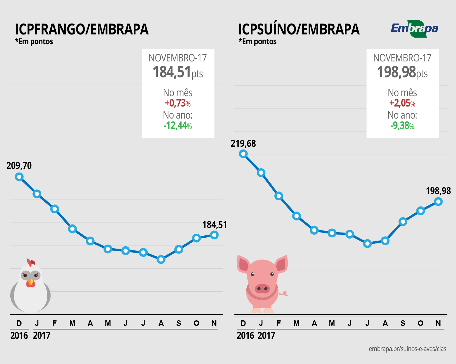 ICP/Embrapa - Os índices de custos de produção foram criados em 2011 pela equipe de socioeconomia da Embrapa Suínos e Aves e Conab. O ICPFrango/Embrapa refere-se aos custos de produção no Paraná para aviário tipo climatizado em pressão positiva, modelo referencial de produção. Já o ICPSuíno/Embrapa é obtido a partir de resultados de custos da produção de suínos em sistema ciclo completo em Santa Catarina.