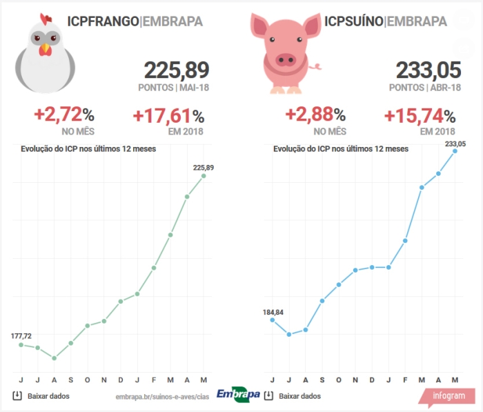 Já o ICPFrango foi de 225,89 pontos em maio, alta de 2,72%. Em 2018, o índice acumula inflação de 17,61%, que chega a 24,06% nos últimos 12 meses.
