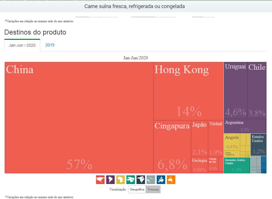 Os embarques do produto para a Ásia renderam ao Brasil uma receita de US$ 843 milhões. Do continente, o país que mais comprou carne suína brasileira foi a China, representando 57% de toda a carne suína exportada pelo Brasil na primeira metade do ano. O total pago pelo produto pelo país asiático neste primeiro semestre foi de US$ 573 milhões, 176,8% a mais do que no período de 2019.