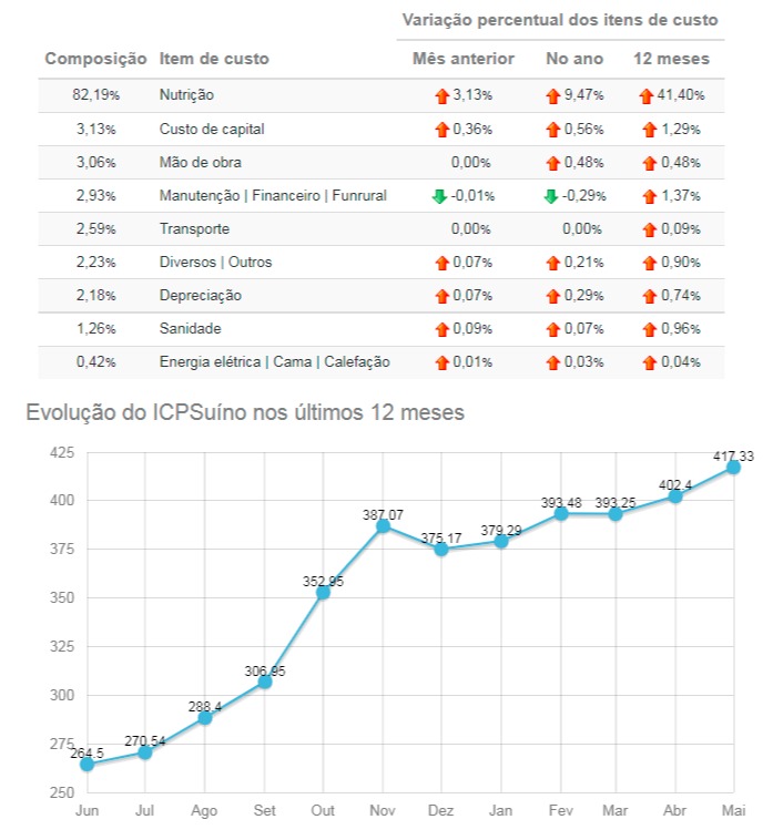 A título de comparação, em abril de 2020, a alimentação dos anaimais representava 79,02% do total de investimentos na granja, segundo a Embrapa. Entre maio de 2020 e o mesmo mês de 2019, a nutrição dos suínos havia avançado 21,38%, valor muito inferior à alta de 41,40% entre maio de 2020 a maio de 2021.