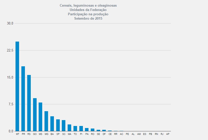 Regionalmente, o volume da produção de cereais, leguminosas e oleaginosas apresentou a seguinte distribuição: Centro-Oeste, 89,6 milhões de toneladas; região Sul, 77,6 milhões de toneladas; Sudeste, 18,8 milhões de toneladas; Nordeste, 17,3 milhões de toneladas; e Norte, 7,2 milhões de toneladas. Comparativamente à safra passada, foram constatados incrementos de 21,5% na região Norte, de 9,6% na região Nordeste, de 4,7% na região Sudeste, de 9,6% na região Sul e de 8,0% na região Centro-Oeste. Nessa avaliação, o Mato Grosso liderou como maior produtor nacional de grãos, com uma participação de 25,0%, seguido pelo Paraná (18,1%) e Rio Grande do Sul (15,7%), que somados representaram 58,8% do total nacional previsto.