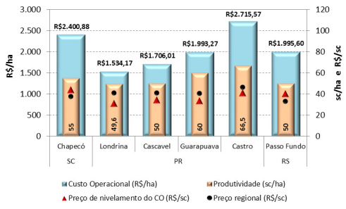 Figura 1 – Custo Operacional, Produtividade, Preço de Nivelamento e Preço Regional para o trigo nas praças acompanhadas pelo Cepea em SC, PR e RS.
