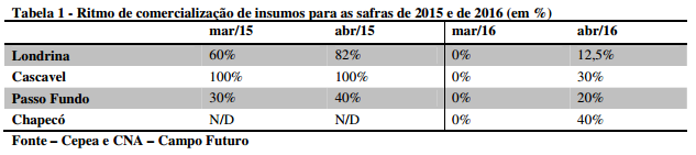 Em meio a esse encarecimento da produção, levantamentos do Cepea mostram que os produtores estão cautelosos para efetivar as compras de insumos. É evidente o atraso na negociação de insumos para a safra 2016 de trigo (Tabela 1). No final de abril do ano passado 100% dos insumos em Cascavel já haviam sido vendidos. Agora, as negociações não passam de 40%. Observa-se também tendência de substituição do trigo pelo milho de inverno, principalmente nas regiões de Londrina e Cascavel.