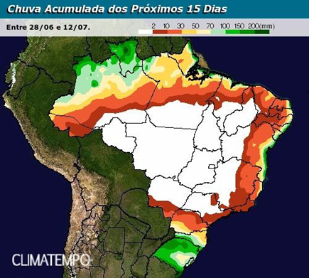 Segundo César Soares, uma situação de bloqueio atmosférico se estabelece sobre a América do Sul e dificulta o deslocamento normal das frentes frias da Argentina para o Brasil. Por isso, nos próximos 10 ou 15 dias, as frentes frias não terão força para chegar ao Brasil com ar polar ou chuva. “O mapa abaixo mostra a estimativa do volume de chuva sobre o Brasil para até 12 de julho. A cor branca representa ausência de chuva e os tons de verde indicam os maiores volumes acumulados”, explica o meteorologista.