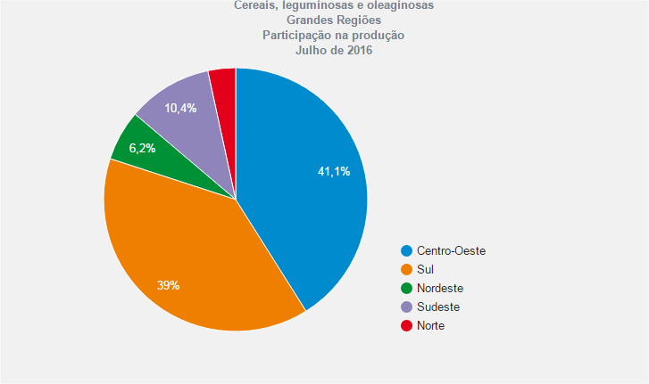 Regionalmente, a produção de cereais, leguminosas e oleaginosas apresentou a seguinte distribuição: Centro-Oeste, 77,6 milhões de toneladas; Sul, 73,6 milhões de toneladas; Sudeste, 19,7 milhões de toneladas; Nordeste, 11,7 milhões de toneladas e Norte, 6,4 milhões de toneladas. Comparativamente à safra passada, houve alta de 2,0% no Sudeste e queda de 17,4% no Norte, de 29,8% no Nordeste, de 13,7% no Centro-Oeste e de 3,0% na Região Sul. Nessa avaliação para 2016, o Mato Grosso liderou como maior produtor nacional de grãos, com uma participação de 24,1%, seguido pelo Paraná (19,1%) e Rio Grande do Sul (16,6%). Esses três estados, somados, representaram 59,8% do total nacional previsto.