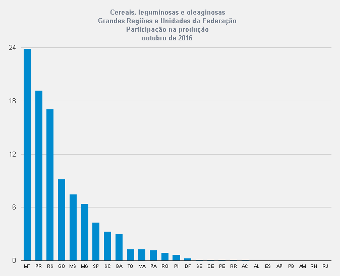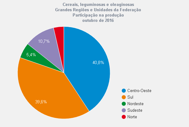 Regionalmente, a décima estimativa para a safra de 2016 aponta produção de cereais, leguminosas e oleaginosas com a seguinte distribuição, em toneladas: Centro-Oeste (75,0 milhões); Sul (72,8 milhões); Sudeste (19,7 milhões); Nordeste (9,8 milhões) e Norte (6,6 milhões). Em relação à safra passada, houve quedas em todas as regiões: Sudeste (-2,1%), Norte (-14,7%), Nordeste (-40,1%), Centro-Oeste (-16,4%) e Sul (-4,0%). Na safra 2016, o Mato Grosso liderou como maior produtor nacional de grãos, com uma participação de 23,9%, seguido pelo Paraná (19,2%) e Rio Grande do Sul (17,1%), que, somados, representaram 60,2 % do total nacional previsto.