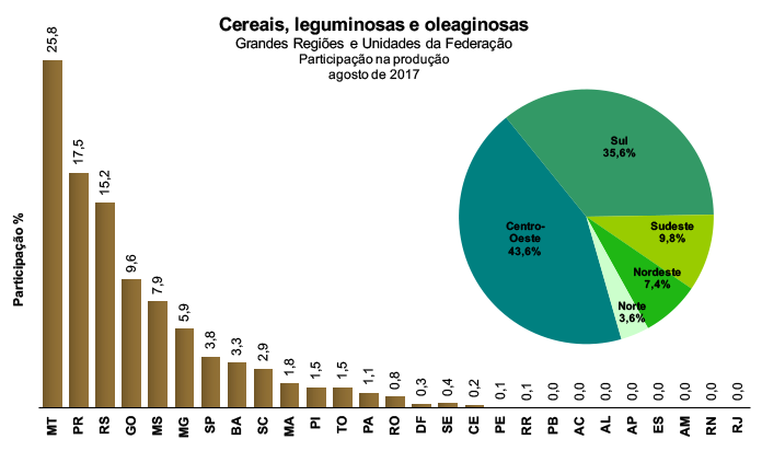Nesta avaliação para 2017, o Mato Grosso liderou como maior produtor nacional de grãos, com uma participação de 25,8%, seguido pelo Paraná (17,5%) e Rio Grande do Sul (15,2%), que, somados, representaram 58,5% do total nacional previsto. Outros estados importantes na produção de grãos foram Goiás (9,6%), Mato Grosso do Sul (7,9%), Minas Gerais (5,9%), São Paulo (3,8%), Bahia (3,3%), Santa Catarina (2,9%) e Maranhão (1,8%) que integram também o grupo dos dez maiores produtores do País.