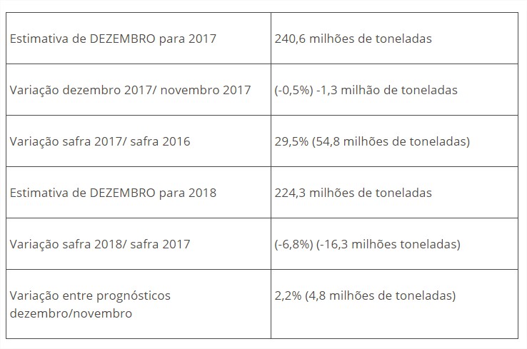 Já a estimativa de dezembro para a safra nacional de grãos de 2017 totalizou 240,6 milhões de toneladas, 29,5% (54,8 milhões de toneladas) maior que em 2016 (185,8 milhões de toneladas). A área a ser colhida (61,2 milhões de hectares) cresceu 7,2% frente a 2016 (57,1 milhões de hectares). Em relação à informação de novembro (241,9 milhões de toneladas), a estimativa da produção diminuiu 0,5%.