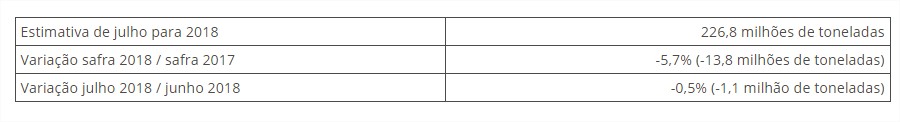 A sétima estimativa de 2018 para a safra nacional de cereais, leguminosas e oleaginosas totalizou 226,8 milhões de toneladas, 5,7% inferior à obtida em 2017 (240,6 milhões de toneladas), com queda de 13,8 milhões de toneladas. A área a ser colhida será de 61,2 milhões de hectares, praticamente a mesma do ano anterior, com aumento de 12.161 hectares frente a 2017 (0,02%).