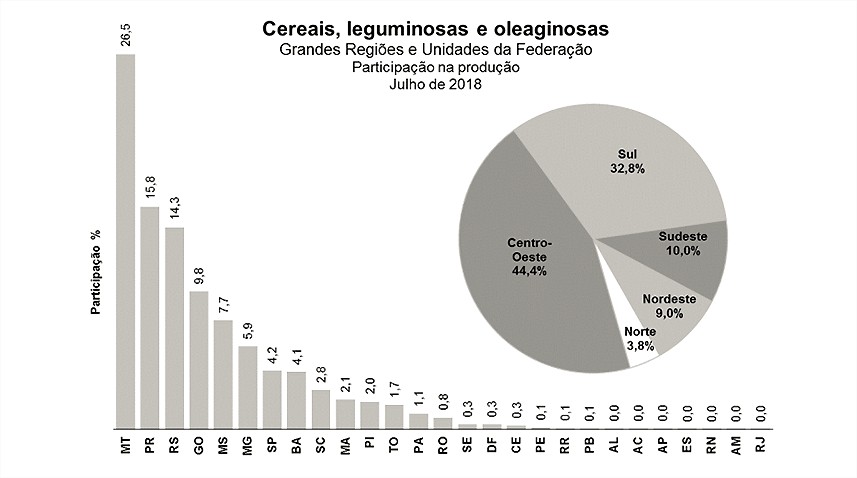 Entre as Grandes Regiões, o volume da produção de cereais, leguminosas e oleaginosas apresentou a seguinte distribuição: Centro-Oeste, 100,5 milhões de toneladas; Sul, 74,5 milhões de toneladas; Sudeste, 22,8 milhões de toneladas; Nordeste, 20,4 milhões de toneladas e Norte, 8,6 milhões de toneladas. Comparativamente à safra passada, houve incremento de 14,0% na Região Nordeste e decréscimos de 6,9% na Região Centro-Oeste, de 5,1% na Região Sul, de 4,8% na Região Sudeste e de 2,9% na Região Norte.