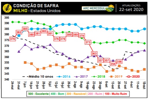 "As condições de safra nos Estados Unidos voltaram a se elevar, justificando uma melhor saúde das culturas em campo que estão em reta final de desenvolvimento e se aproximando da colheita", resume bem a ARC Mercosul.