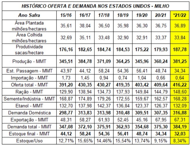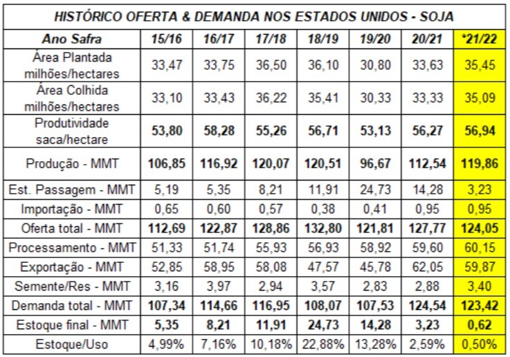 Os Estados Unidos vêm de duas safras de perdas em função de adversidades climáticas e, consequentemente, de estoques de passagem apertados nas últimas temporadas. No paralelo, a demanda foi crescendo de forma agressiva e, mesmo com a 'guerra comercial' ainda entre China e EUA, as compras de soja e milho da nação asiática no mercado norte-americano foram recordes na temporada 2020/21.