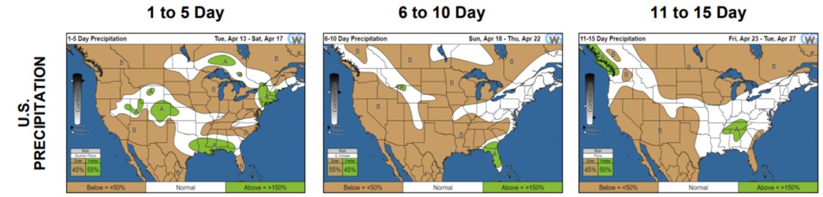 No intervalo de 18 a 22 de abril, nos próximos 6 a 10 dias, ainda de acordo com o CWG, as chuvas deverão ficar abaixo do normal para quase toda a área produtora de grãos nos EUA - como mostram os mapas abaixo - e voltam à normalidade em alguns pontos entre os dias 23 e 27.