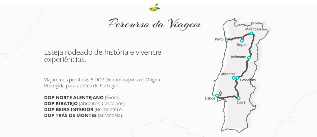 O roteiro de 12 dias sairá de São Paulo no dia 09 de Novembro e primeiramente passará por Lisboa, capital de Portugal. O grupo poderá conhecer os principais pontos turísticos da cidade, que tem se destacado por iincentivos à sustentabilidade ambiental e plataformas sociais inovadoras. Após conhecer Lisboa, o grupo passará por diversos locais no interior do país, seguindo para a região de Évora e Alentejo, aonde passarão pelo Herdade do Esporão, propriedade onde a cultura da oliveira existe há várias gerações. Parte deste olival segue o sistema tradicional, sendo os olivais mais novos conduzidos em regime intensivo.