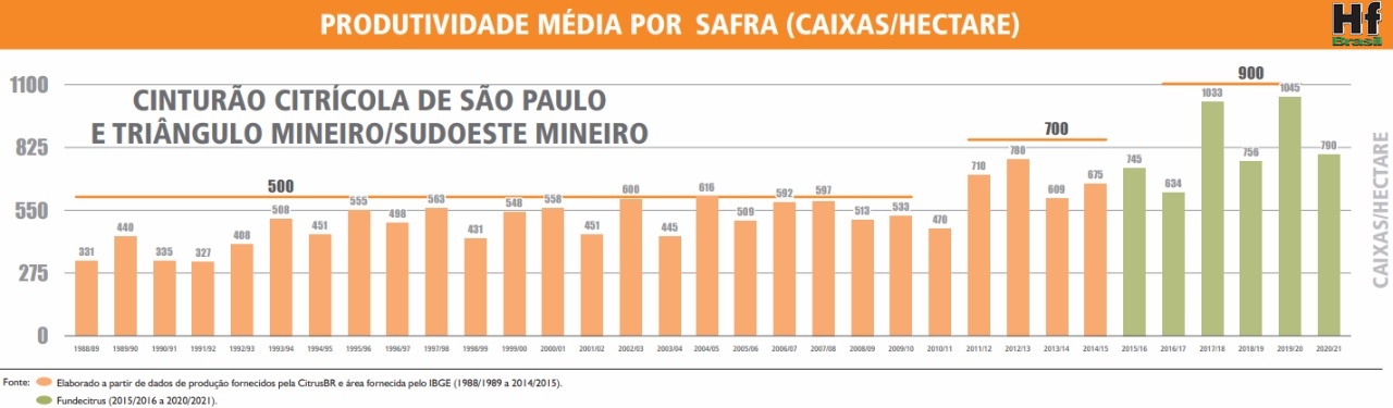 As variações na produtividade são um comportamento típico na citricultura paulista. No entanto, desde 2016/17, com a retomada dos investimentos em novos pomares mais adensados, aliados à intensificação do manejo fitossanitário, observa-se oscilação de produtividade ainda maior entre as safras.