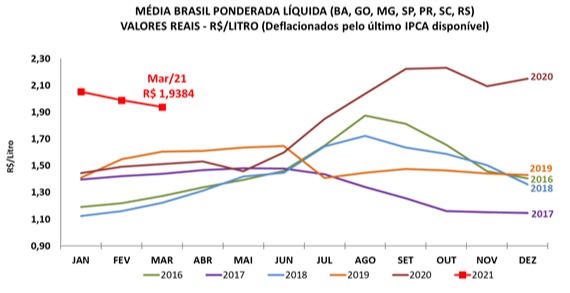 De acordo com pesquisas do Cepea (Centro de Estudos Avançados em Economia Aplicada), da Esalq/USP, o preço do leite captado em fevereiro e pago aos produtores em março recuou 2,5% na “Média Brasil” líquida, chegando a R$ 1,9384/litro. Com isso, a queda acumulada no primeiro trimestre do ano chega a 9,8%, em termos reais (descontando a inflação pelo IPCA de fevereiro/21). Ainda assim, esse valor é recorde para um mês de março e supera em 28,3% o registrado no mesmo período de 2020.