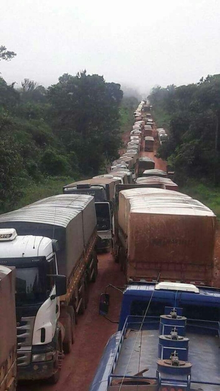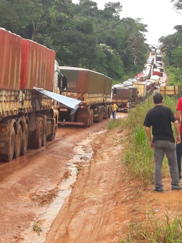O grande atoleiro formado no trecho da rodovia BR-163, que fica entre os municípios de Trairão e Novo Progresso, no sudeste do Pará, provoca um congestionamento de 50 quilômetros. Todos os tipos de veículos estão com dificuldades de passar pelo local.