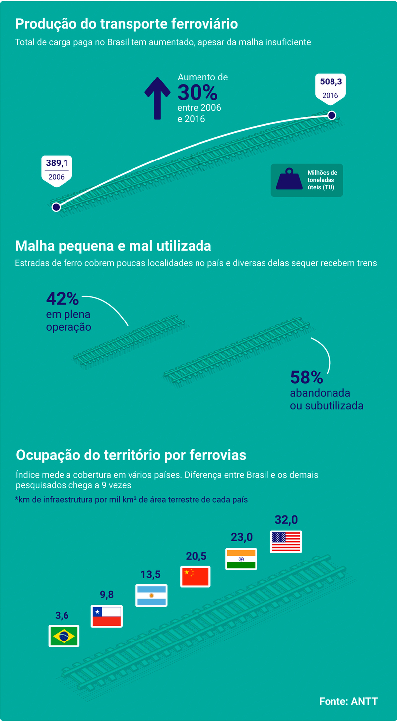 Dados da União Internacional de Vias Ferroviárias, apontam que o Brasil ocupa a nona posição em extensão de linhas de trens, com mais de 30 mil quilômetros de malha. Em relação à qualidade da infraestrutura, segundo o Fórum Econômico Mundial, em 2018, o país estava na 88ª posição entre 137 analisados.