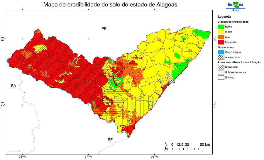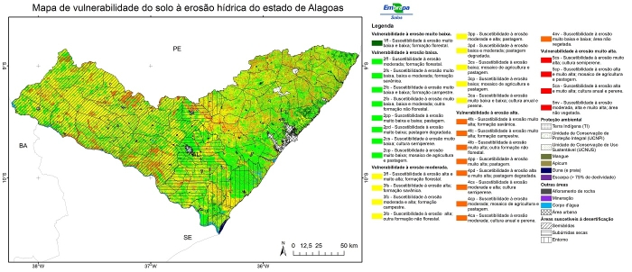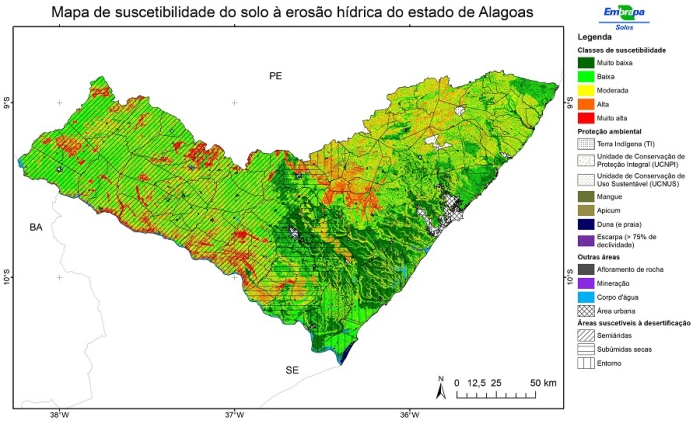 Um estudo da Embrapa identificou e mapeou as áreas suscetíveis e vulneráveis à erosão hídrica do estado de Alagoas. Foram elaborados três mapas temáticos que poderão apoiar o setor produtivo e o poder público na tomada de decisão para priorização e seleção das unidades territoriais mais vulneráveis à erosão em programas de conservação, recuperação ou reinserção de áreas com potencial produtivo. Os mapas de erodibilidade, de vulnerabilidade e de suscetibilidade do solo à erosão hídrica de Alagoas, na escala 1:250.000, serão disponibilizados para a sociedade na plataforma Geoinfo, interligada à Infraestrutura Nacional de Dados Espaciais (Inde), após a entrega ao Ministério da Agricultura, Pecuária e Abastecimento (Mapa).