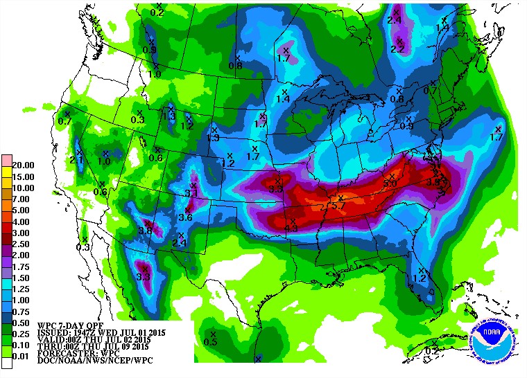 Chuvas previstas nos próximos 7 dias nos EUA - Fonte: NOAA
