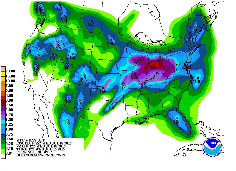 Chuvas nos EUA entre os dias 8 a 15 de julho - Fonte: NOAA