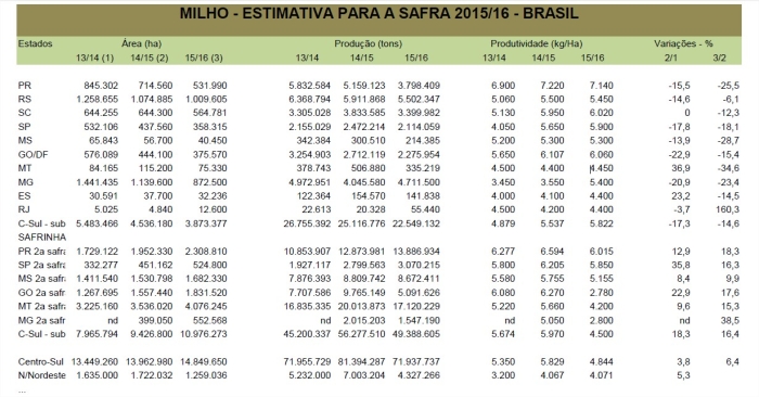 Molinari afirma que a safra de verão da região Centro-Sul deverá cair de 25,116 milhões de toneladas para 22,549 milhões de toneladas. A área recuou 14,6%, de 4,536 milhões de hectares para 3,873 milhões de hectares. O rendimento ficou em 5.822 quilos por hectare.