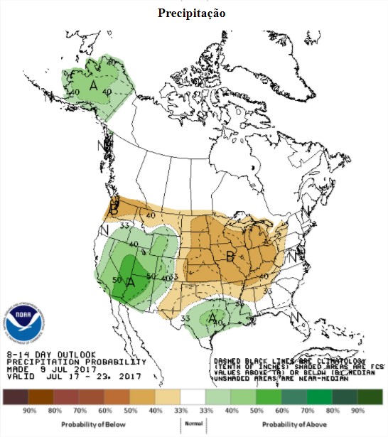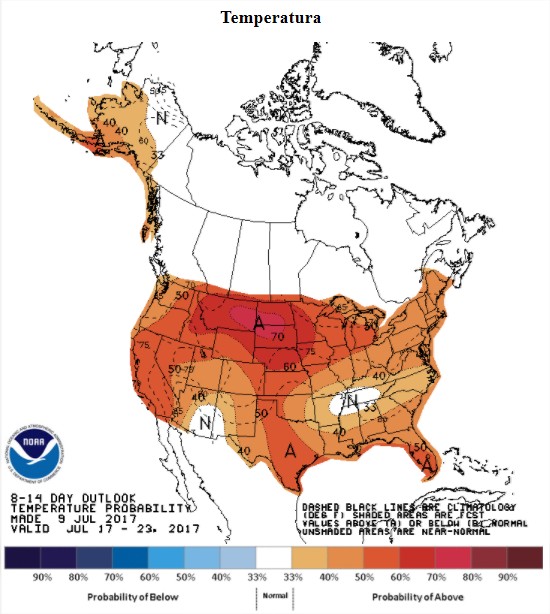 De acordo com os últimos mapas do NOAA - Serviço Oficial de Meteorologia do país - nos próximos 8 a 14 dias, todo o país deverá ter temperaturas acima da média. No mesmo período, as chuvas ficarão abaixo da normalidade no Corn Belt, no momento em que as lavouras estão em fase de polinização.