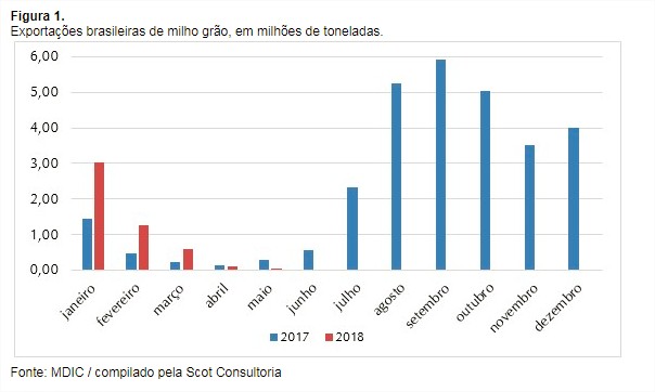 Daqui para frente, a expectativa é de que os volumes embarcados aumentem, conforme avança a colheita da segunda safra no país (2017/2018) e aumenta a disponibilidade interna. O dólar valorizado frente ao real é outro fator que deverá favorecer os embarques.