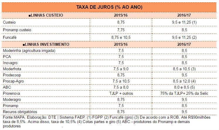 As taxas de juros de crédito rural para a safra 2016/17 aumentaram em média de 8,75% para 9,5%. No Pronamp, os juros passaram de 7,75% para 8,5%. Os juros das linhas de investimento tiveram ajustes, dependendo da linha estão entre 8,5% a 12%. Esse aumento deve afastar mais ainda os produtores rurais na tomada de empréstimos para compra de máquinas, equipamentos e implementação de novas tecnologias com recursos do BNDES.