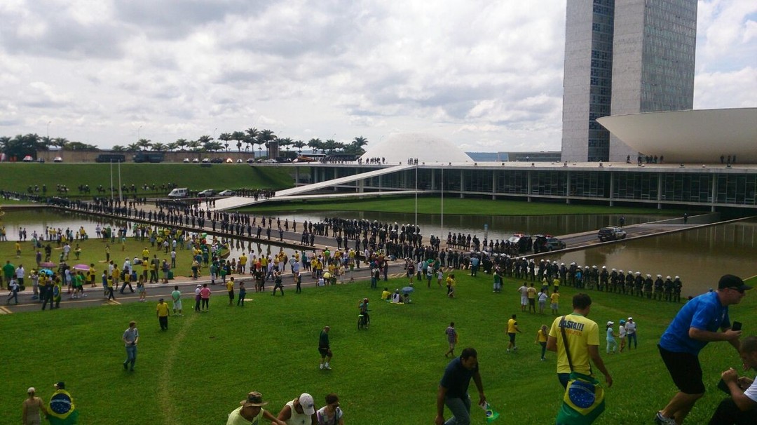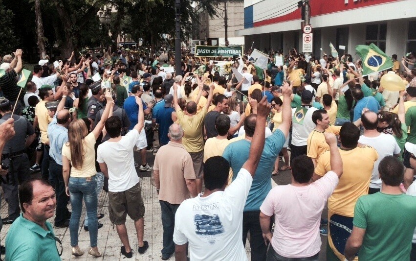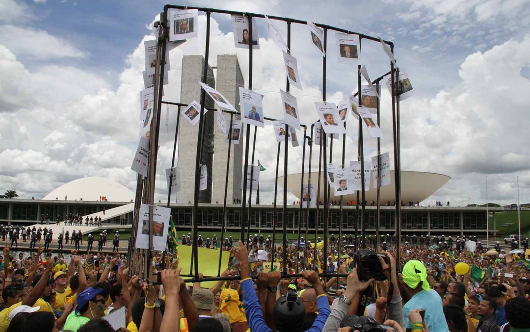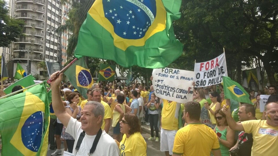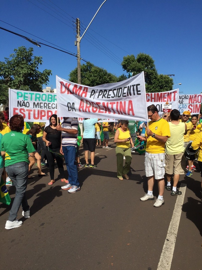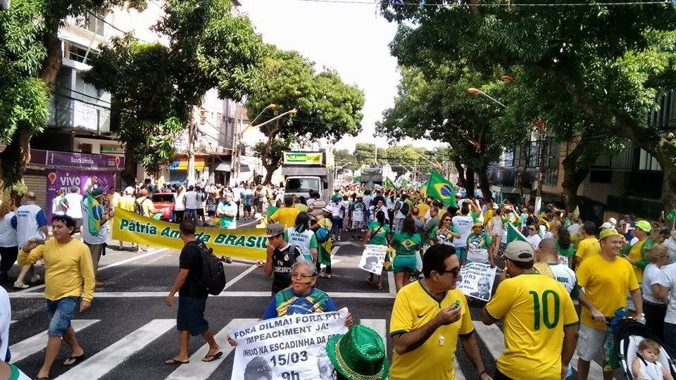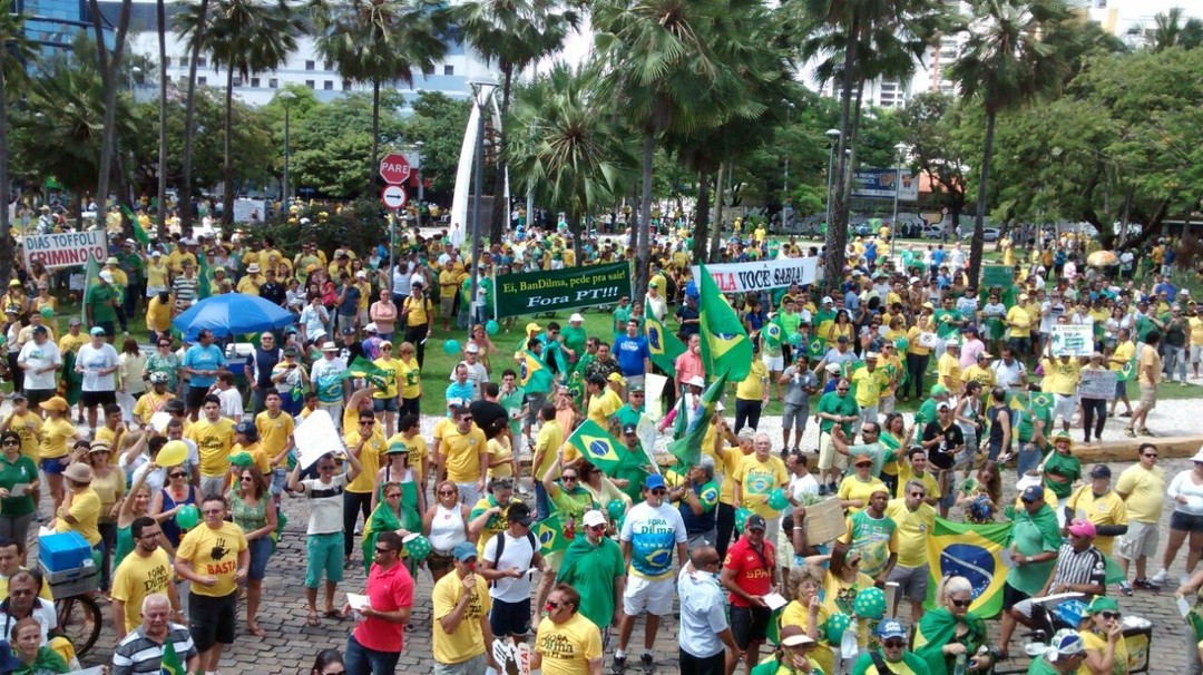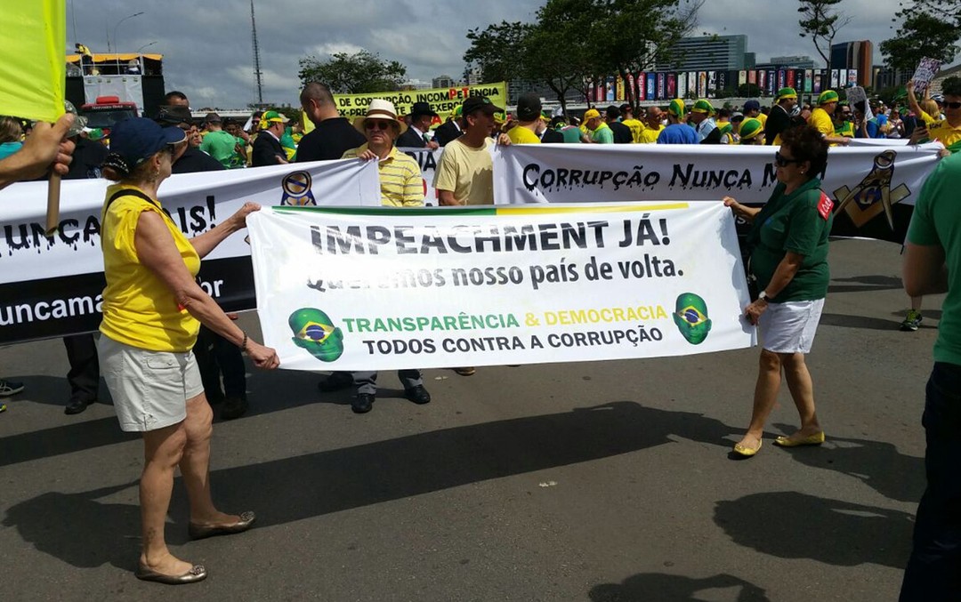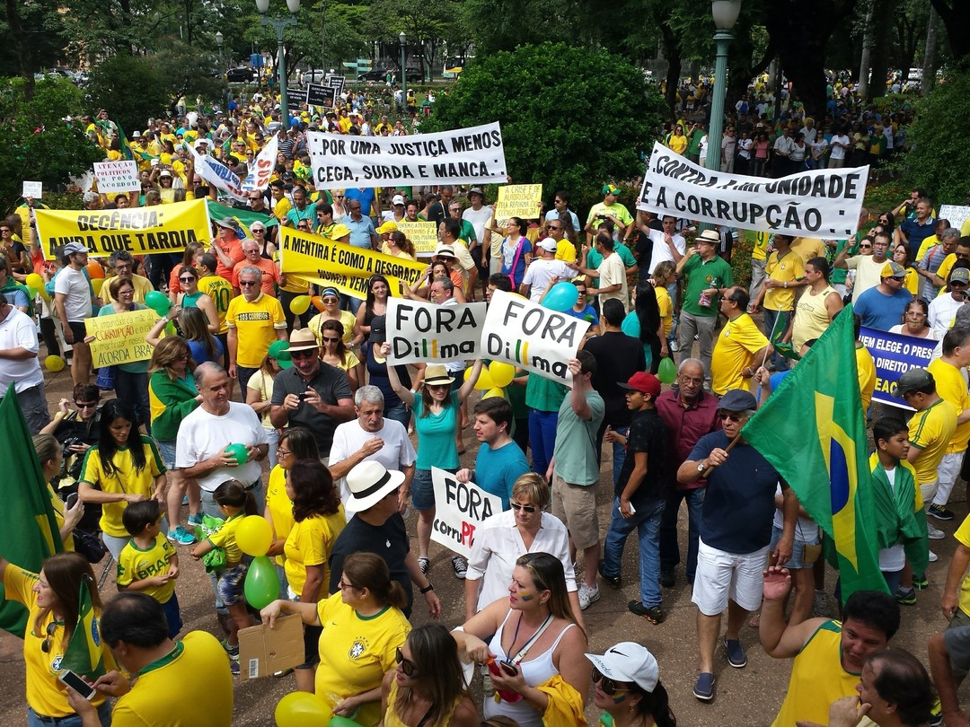 O governo de Dilma Rousseff foi alvo neste domingo da maior manifestação espontânea já feita no Brasil contra um presidente da República. Vestidos de verde e amarelo, os brasileiros foram às ruas em todos os estados e no Distrito Federal para protestar contra a presidente e o Partido dos Trabalhadores. Ao menos 1,4 milhão de pessoas tomaram praças e percorreram avenidas, segundo estimativas das Polícias Militares nos Estados. O número, contudo, não leva em conta manifestações realizadas no interior, que podem elevar significativamente o total.