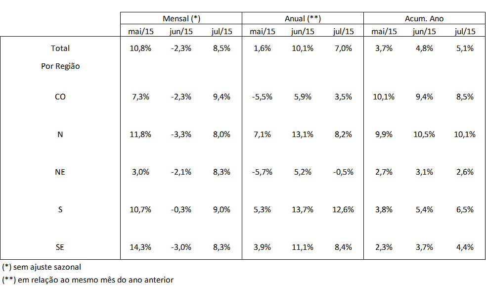 Todas as regiões geográficas do país registraram altas mensais nas demandas dos seus consumidores por crédito em julho/15. A maior delas ocorreu no Centro-Oeste: alta de 9,4% perante junho/15. No Sul o crescimento foi de 9,0%. O Nordeste e o Sudeste exibiram avanços idênticos de 8,3% em julho/15 e, por fim, no Norte o crescimento foi de 8,0% perante junho/15.