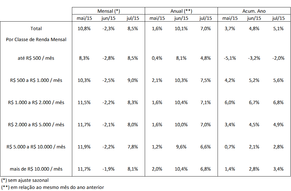 Na comparação o mesmo período acumulado do ano passado (janeiro a julho de 2014), houve retração na demanda por crédito apenas na faixa menor de renda mensal: queda de 2,0% para os consumidores que recebem até R$ 500 por mês. Para os que ganham entre R$ 500 e R$ 1.000 mensais, o crescimento de janeiro a julho de 2015 foi de 5,6%; para os que recebem entre R$ 1.000 e R$ 2.000 foi de 6,8%; e para os que possuem renda mensal entre R$ 2.000 e R$ 5.000, a alta foi de 4,9%. Houve crescimento menos pronunciado da demanda por crédito nas camadas de rendas mais elevadas da população no acumulado de janeiro a julho de 2015: altas de 2,8% para os que ganham entre R$ 5.000 e R$ 10.000 e de 3,4% para aqueles que recebem mais de R$ 10.000 por mês.