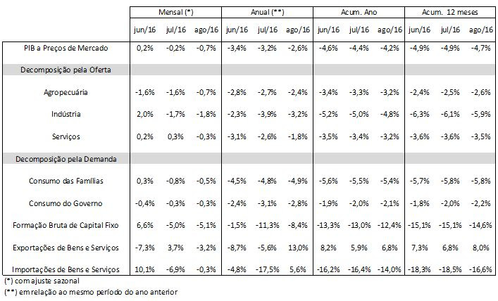 Já do ponto de vista da demanda agregada, todos os componentes da demanda doméstica recuaram em agosto/16: consumo das famílias (-0,5%); consumo do governo (-0,3%), investimentos (-5,1%) e exportações (-3,2%). As importações também recuaram em agosto/16: queda de 0,3% frente julho/16, já efetuados os devidos ajustes sazonais.