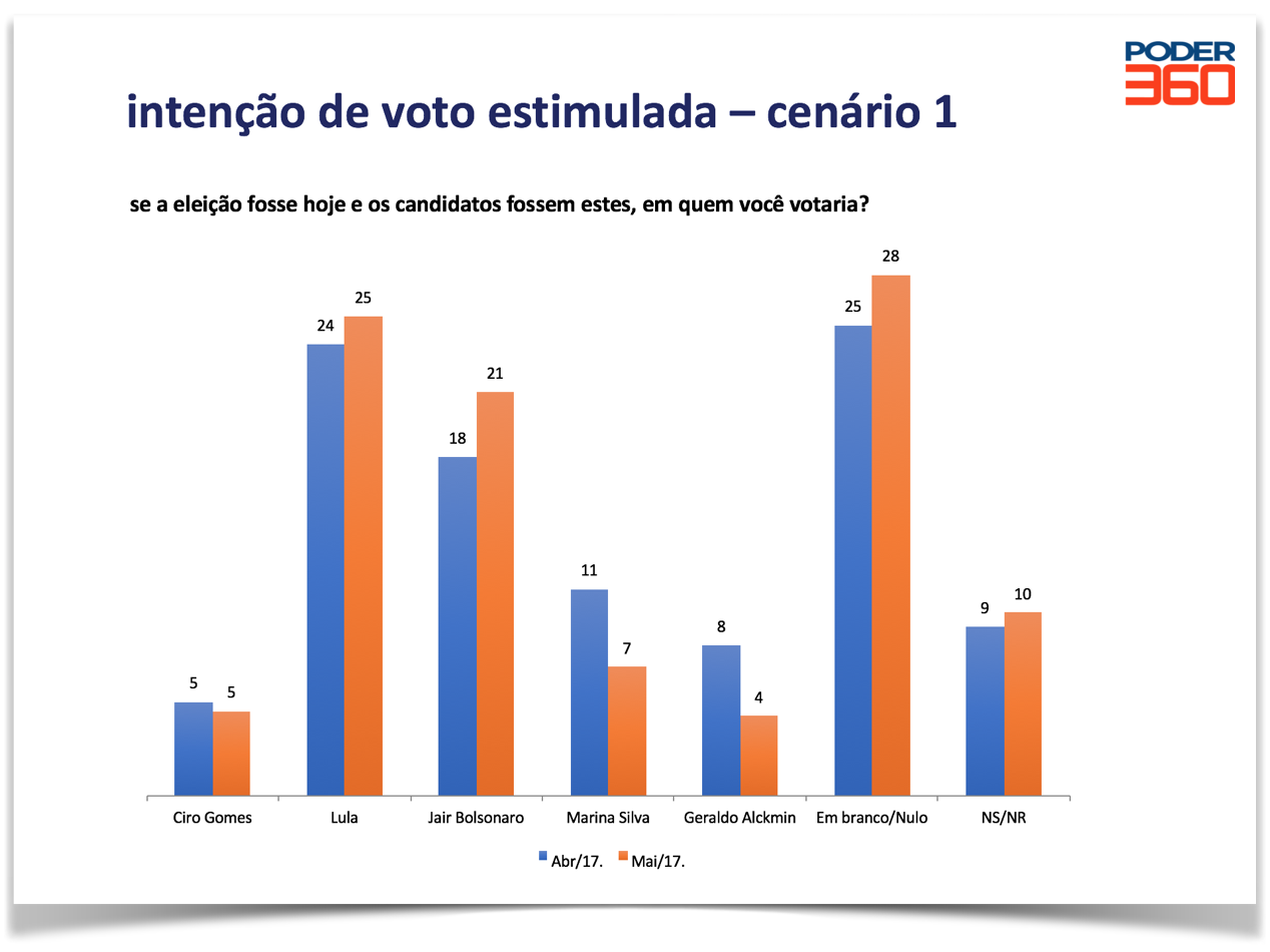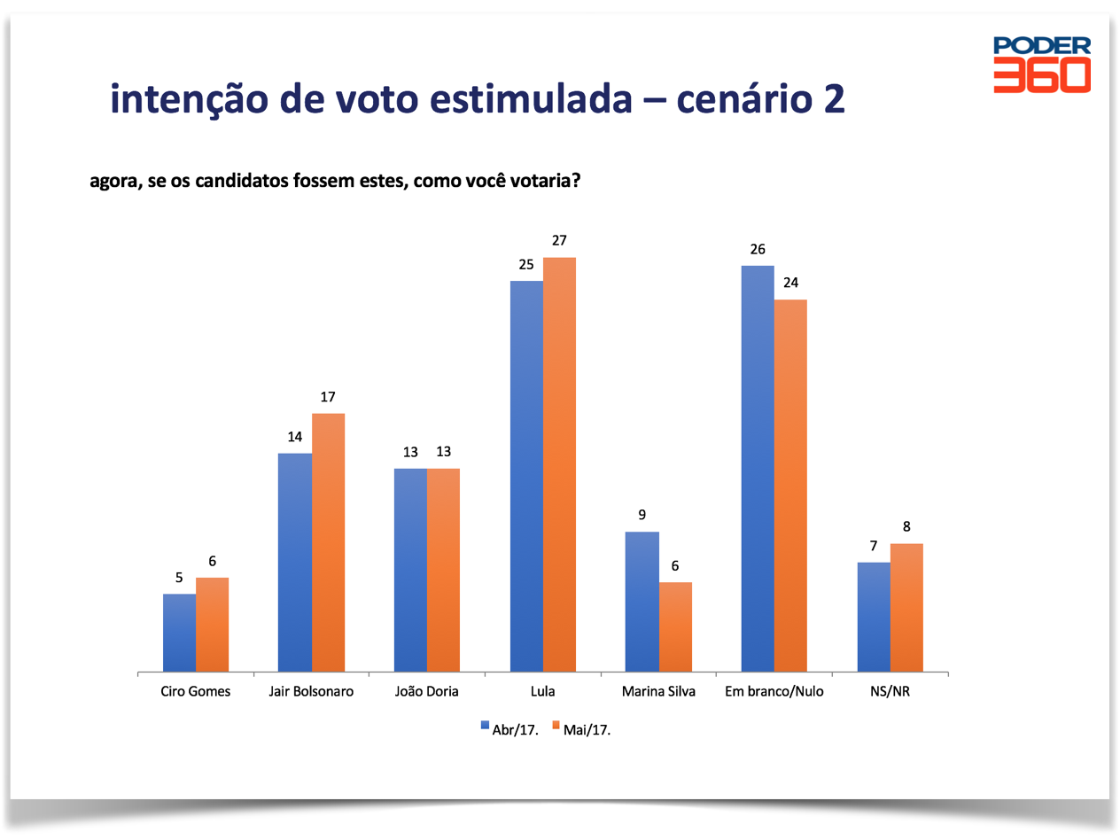 O ex-presidente Luiz Inácio Lula da Silva (PT), 71 anos, continua na liderança em 2 cenários testados para a eleição presidencial de 2018 em pesquisa nacional do DataPoder360. Atrás do petista estão o deputado federal Jair Bolsonaro (PSC), 62, e o prefeito de São Paulo, João Doria (PSDB), 59.