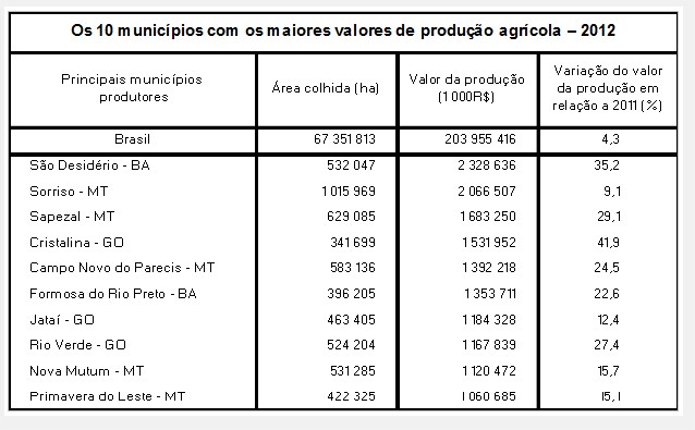 São Desidério (BA) ultrapassou Sorriso (MT) e foi o município com maior valor de produção em 2012, com alta de 35,2% em relação a 2011. Mas a produção agrícola em Sorriso cresceu 124,6% no ano, e este município continua sendo o maior produtor nacional de soja e milho.