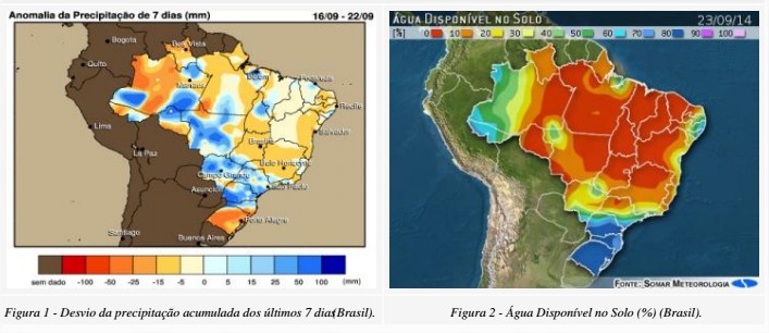 Para essa semana há previsão de mais chuvas no Paraná, que poderão atrapalhar o andamento do plantio do Estado, porque os volumes passarão dos 50mm. O tempo só ficará favorável ao plantio no início da próxima semana. Em Mato Grosso, a semana será de tempo aberto e temperaturas altas, com possibilidade apenas para chuva fraca. Somente no final de semana é que há previsão de chuvas mais fortes, porém ainda irregulares.