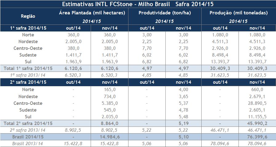 A estimativa de novembro da INTL FCStone trouxe uma produção de 76,4 milhões de toneladas de milho para o safra 2014/15 no Brasil, o quer representa uma queda frente ao ciclo 2013/14.