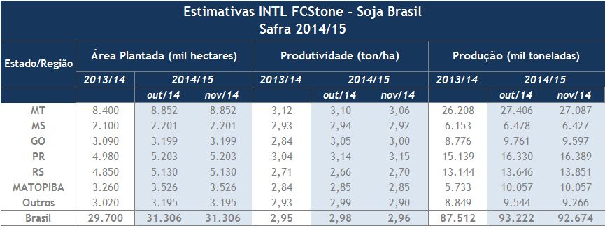 Na estimativa de safra brasileira de novembro, o número da INTL FCStone foi revisto, em função de ajustes na produtividade da soja em alguns estados. Com isso, a produção em 2014/15 deve ficar em 92,67 milhões de toneladas.