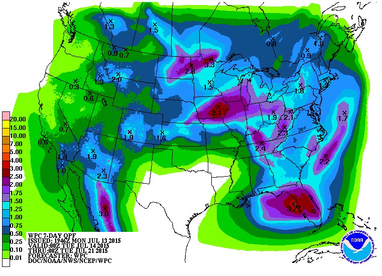 Previsão de chuvas para os próximos 7 dias nos EUA - Fonte: NOAA