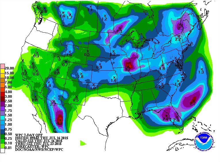 Previsão de Chuvas nos EUA nos próximos 7 dias - Fonte: NOAA
