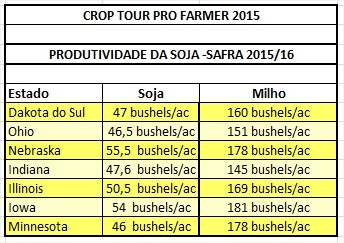 Na tabela abaixo seguem as produtividades estimadas para a soja e para o milho pelo Crop Tour Pro Farmer, realizado nos últimos dias: