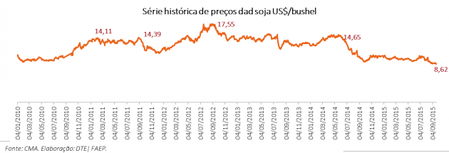 Os preços internacionais foram menores no ano de 2015 comparativamente aos anos anteriores, como consequência de uma oferta mundial maior. Os preços no mercado interno buscaram sustentação no câmbio e assim, mesmo com a elevação nos preços dos insumos a cultura conseguiu saldar os custos de produção e sustentar a relação entre preço e custo inclusive de outras culturas, de modo geral.