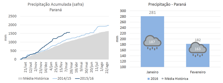 Na região Norte Central, a maior produtora de soja do estado paranaense, verificou-se um valor quase 50% maior em 2015/16 do que em 2014/15 e quase 60% maior em relação à média histórica, considerando o volume de chuvas acumulado desde o início do período de plantio até o final de fevereiro.