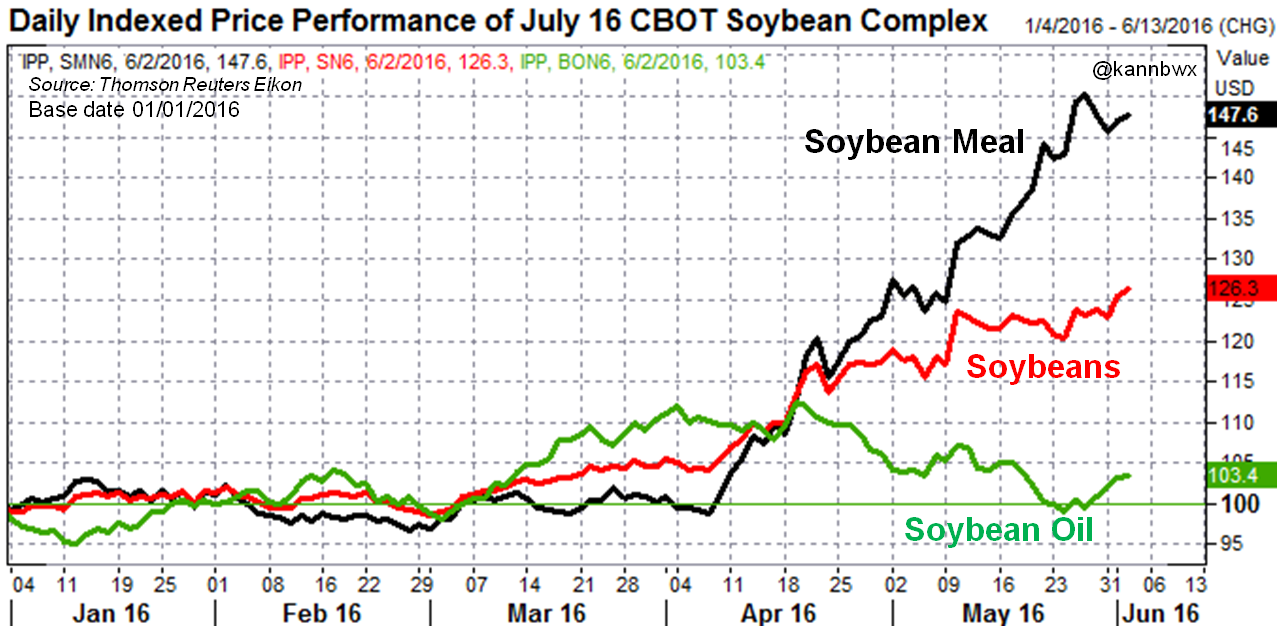 O mercado do farelo de soja na CBOT, tradicionalmente, acompanha a movimentação do grãos. Porém, nos últimos pregões o que se observou foi uma performance ainda melhor das cotações do derivado em seu rally. De janeiro ao início de junho, a primeira posição subiu 54,84%, enquanto a soja em grão acumula uma alta de 33,64%.