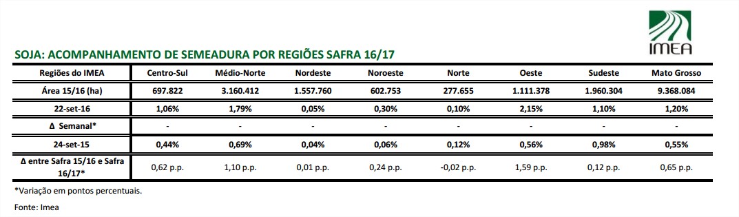 Em meio às recentes pancadas de chuvas, os produtores rurais do Centro-Oeste iniciaram a semeadura da soja da safra 2016/17. No principal estado produtor do grão, Mato Grosso, a semeadura já estava completa em 1,20% da área projetada para essa temporada até o final da última semana, de acordo com levantamento elaborado pelo Imea (Instituto Mato-grossense de Economia Agropecuária). No mesmo período do ano anterior, o índice era de 0,55%.