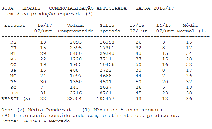 Porto Alegre, 10 de outubro de 2016 – A comercialização antecipada da safra 2016/17 de soja do Brasil já envolve 22% da produção projetada, conforme relatório de SAFRAS & Mercado, com dados recolhidos até 7 de outubro.