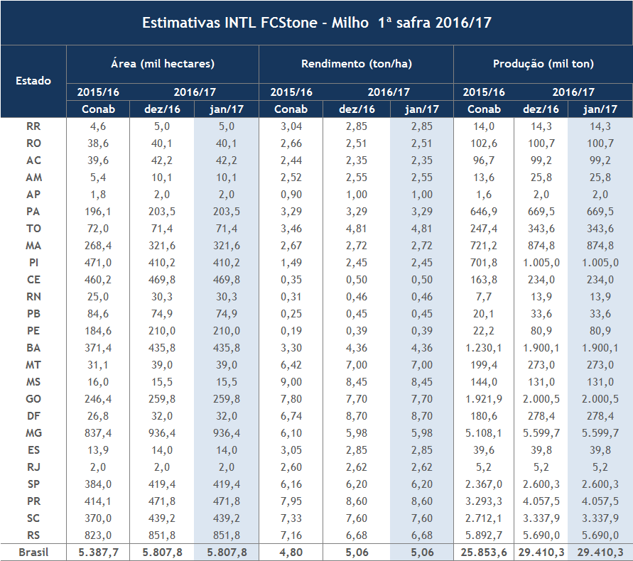 Para a safra de milho, a INTL FCStone manteve sua estimativa de produção em 91,05 milhões de toneladas no ciclo 2016/17. Esse nível seria um recorde histórico de produção do cereal.
