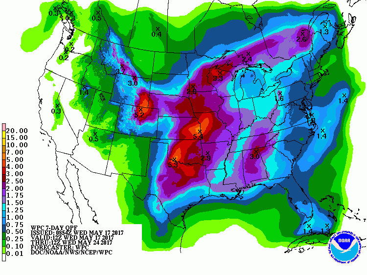 O mapa a seguir mostra as chuvas previstas para os próximos 7 dias nos EUA, e parte do NOAA, a agência oficial de clima dos Estados Unidos. Os acumulados esperados para alguns dos principais estados produtores do Corn Belt - como Iowa, Missouri, Illinois, Kansas e Nebraska - podem receber de 45 a até 127 mm nos acumulados.