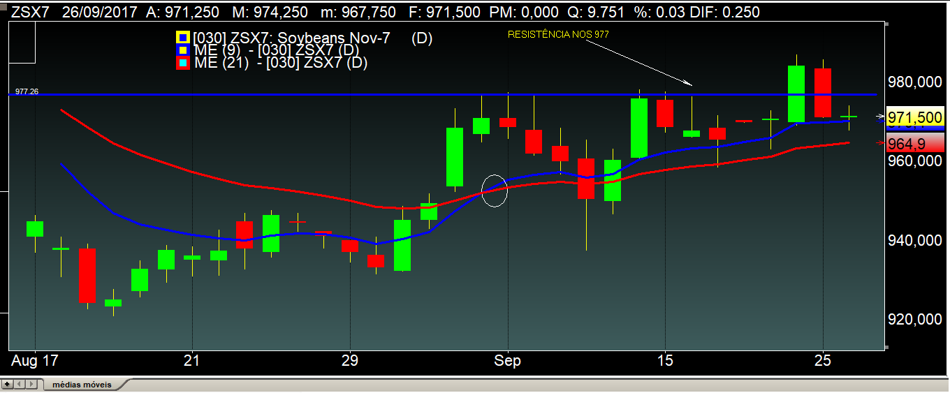 Bom dia! Os contratos futuros de soja operam em território praticamente neutro nesta manha de terça-feira (26/09). O contrato de novembro vai trabalhando no “0 x 0” exatamente nos mesmos US$ 971,50 de ontem.
